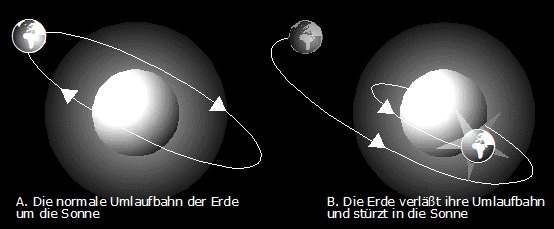 Doch genau diese Winzigkeit kann der Menschheit zum Verhängnis werden. Die angesehenen US-Wissenschaftler Nussbaum und Murphy haben berechnet, dass bereits ein Gewichtsschwund von einem 100-Milliardenstel des Planeteneigengewichtes ausreicht, damit die Erde ihre angestammte Umlaufbahn verläßt. Sie nähert sich der Sonne an.