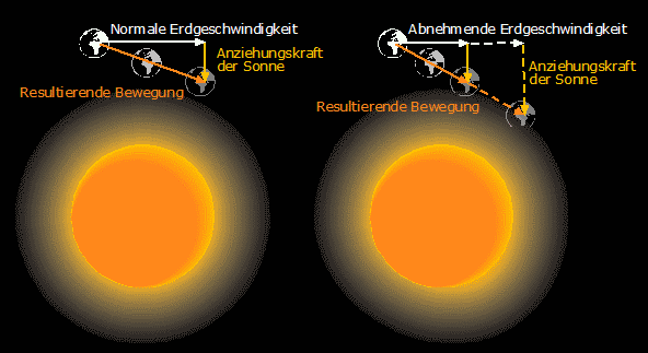 Mit abnehmender Masse nimmt auch die Geschwindigkeit der Erde, mit der sie die Sonne umkreist, immer weiter ab. Die folgende Grafik veranschaulicht, dass sich die Erde in einem steileren Winkel der Sonne nähert,